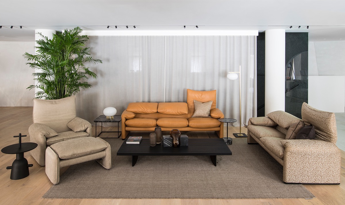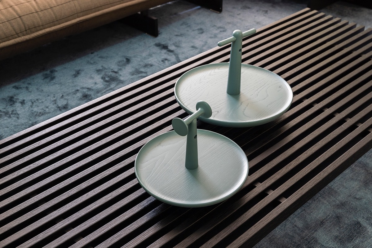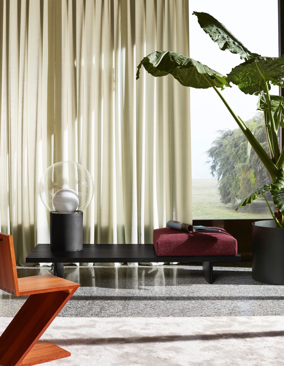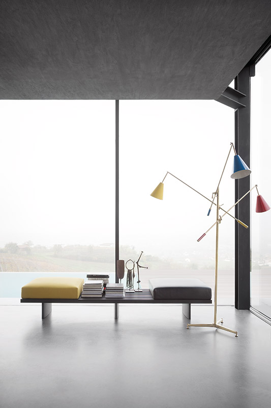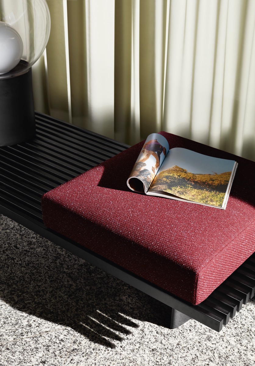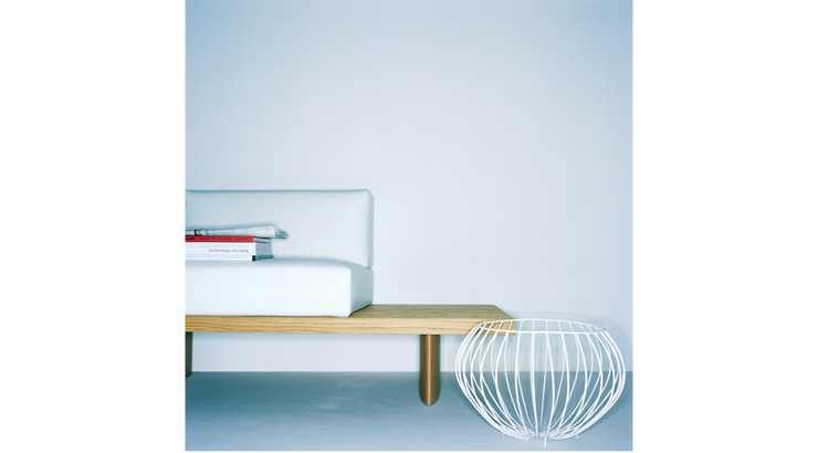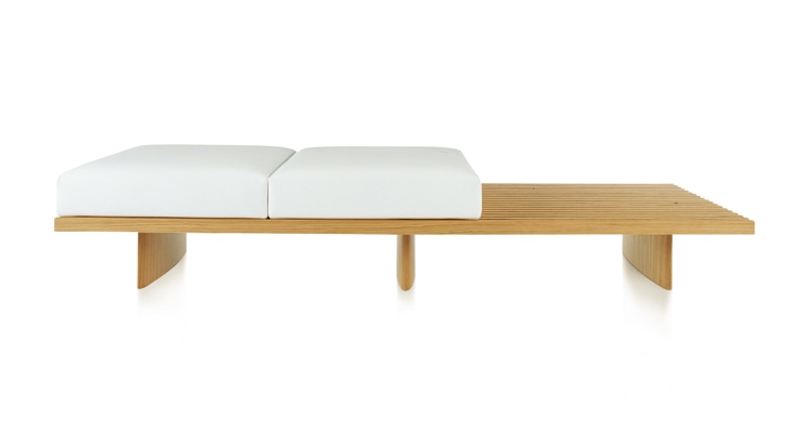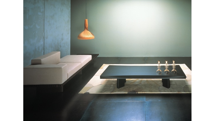 1953年、東京でシャルロット・ペリアンが自身のためにデザインした作品です。格子状に構成された木のベースは、コーヒーテーブルやテレビ台として、またクッションを載せて座ったときに理想的なソファの高さになるよう作られています。パーツとなるクッションは、モデュールの組み合わせで、腰掛けたり、横たわったりなど、用途によってさまざまな配置が可能。限定されたサイズの中にフレキシブルな構造を備えることで、空間に軽さと広がりをもたらしています。