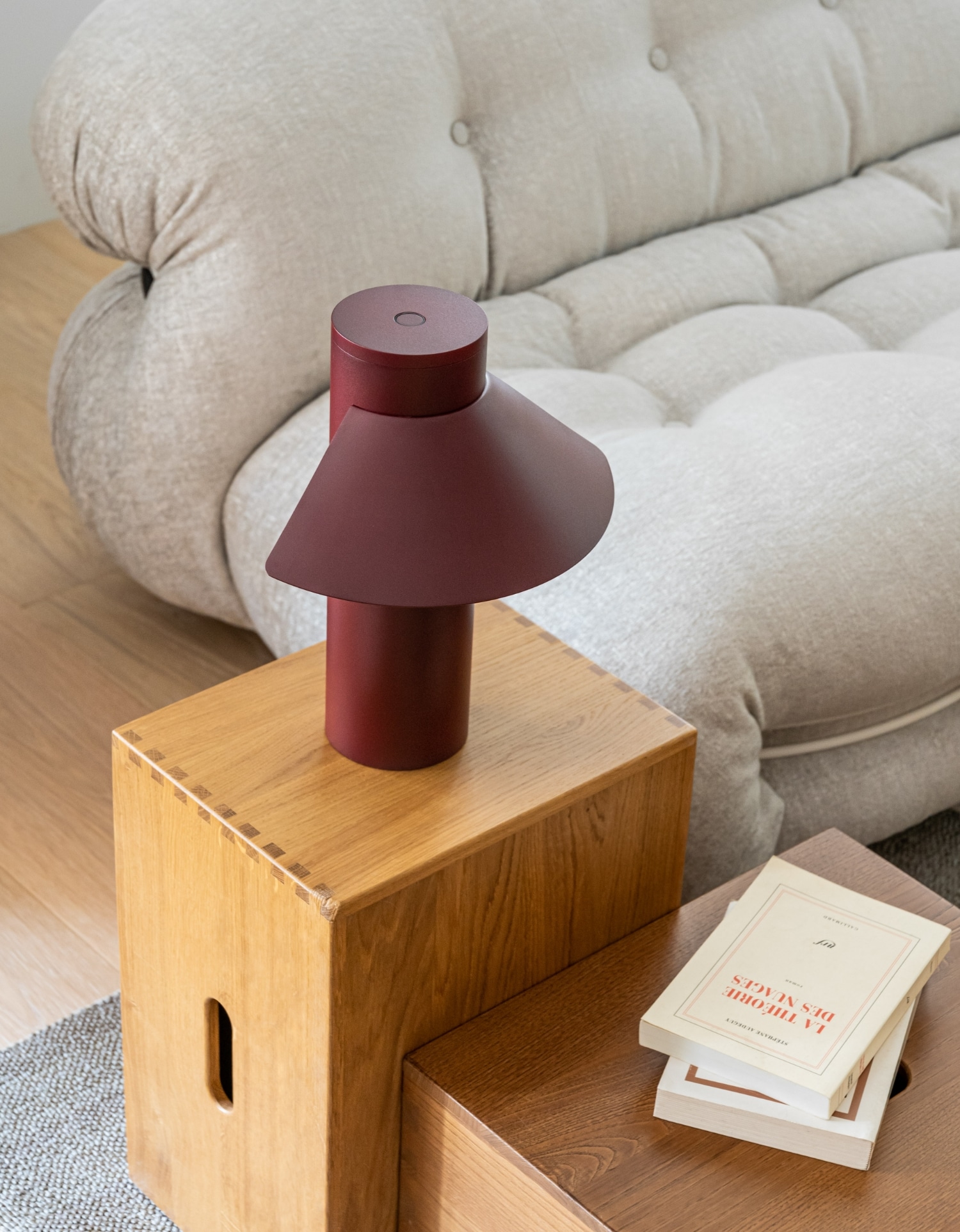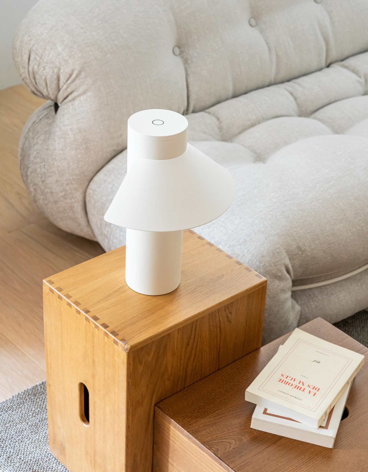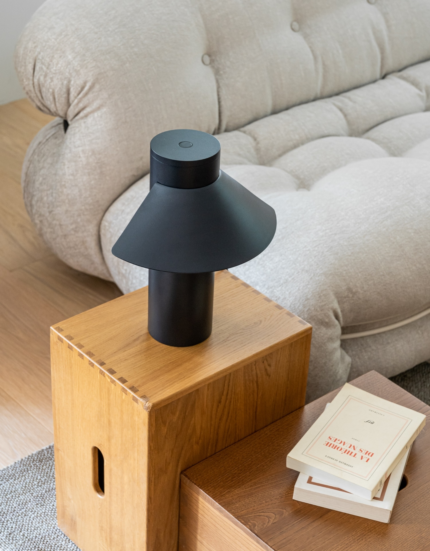 イタリア語で人力車の意味を持つリーショは、イタリアのデザイナー、ジョエ・コロンボがアジアの文化にインスパイアされ、1968年にデザインしたテーブルランプです。マットで滑らかに塗装された三角形のセードがボディから浮遊しているかのように見えます。LED光源とボディ上部のタッチ調光スイッチにより現代でも使いやすいかたちで復刻し、時代を超えてあらゆる空間を照らし続けています。
