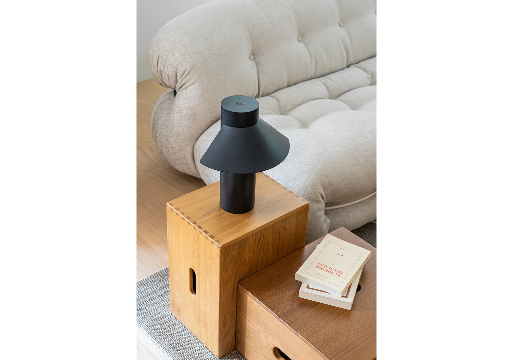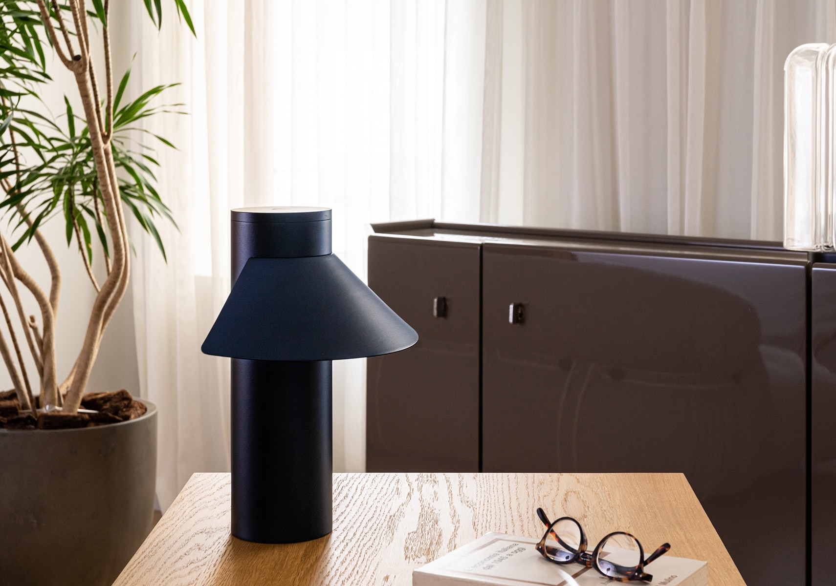 イタリア語で人力車の意味を持つリーショは、イタリアのデザイナー、ジョエ・コロンボがアジアの文化にインスパイアされ、1968年にデザインしたテーブルランプです。マットで滑らかに塗装された三角形のセードがボディから浮遊しているかのように見えます。LED光源とボディ上部のタッチ調光スイッチにより現代でも使いやすいかたちで復刻し、時代を超えてあらゆる空間を照らし続けています。