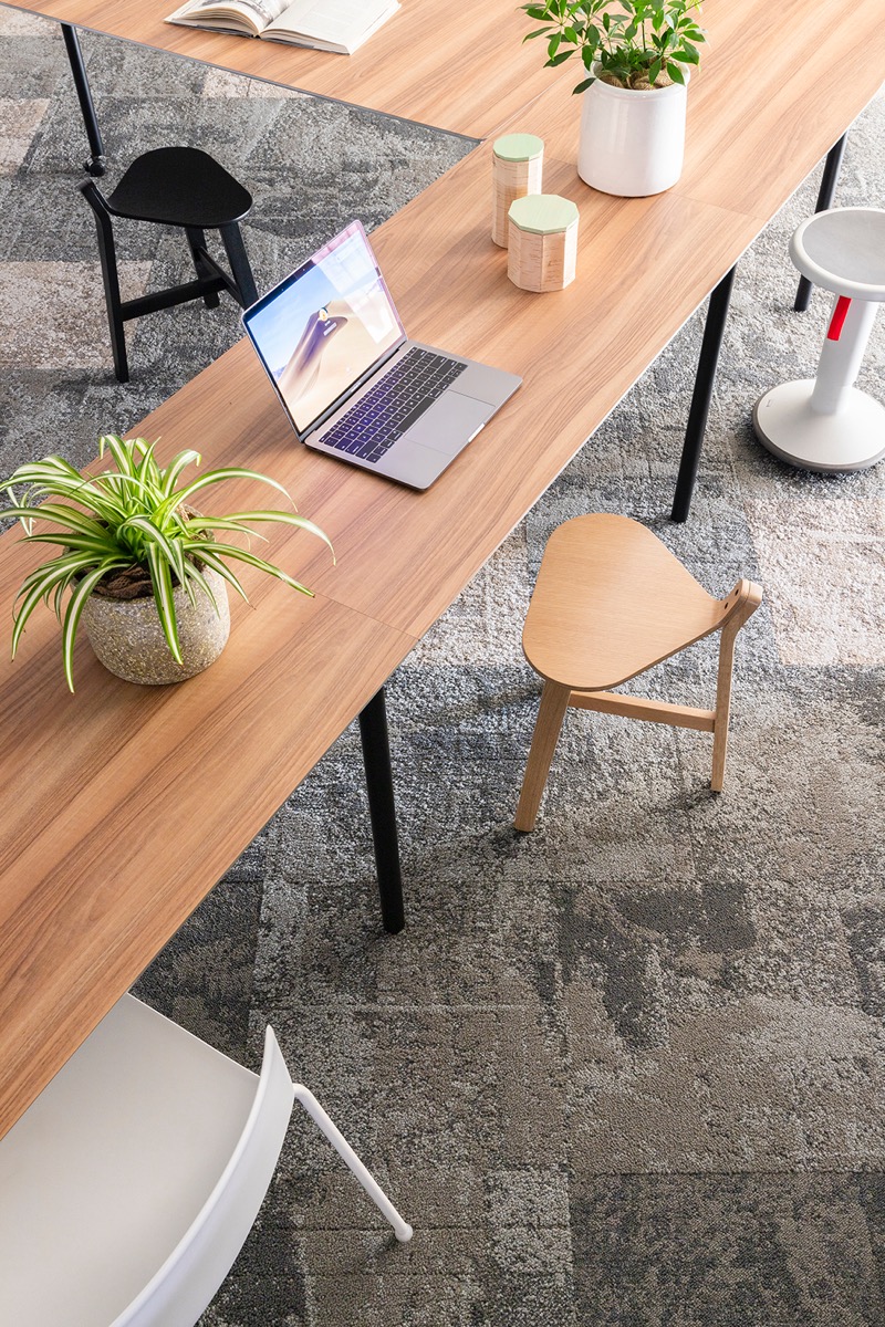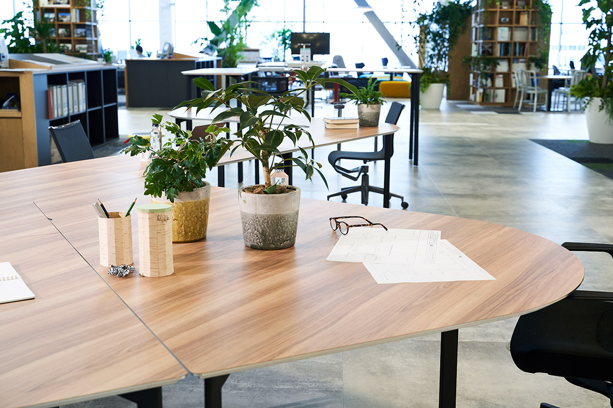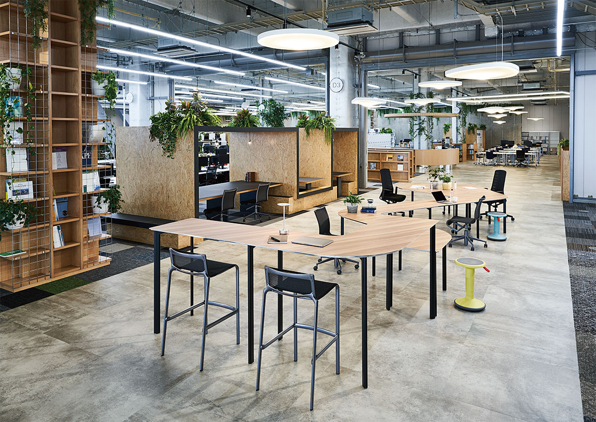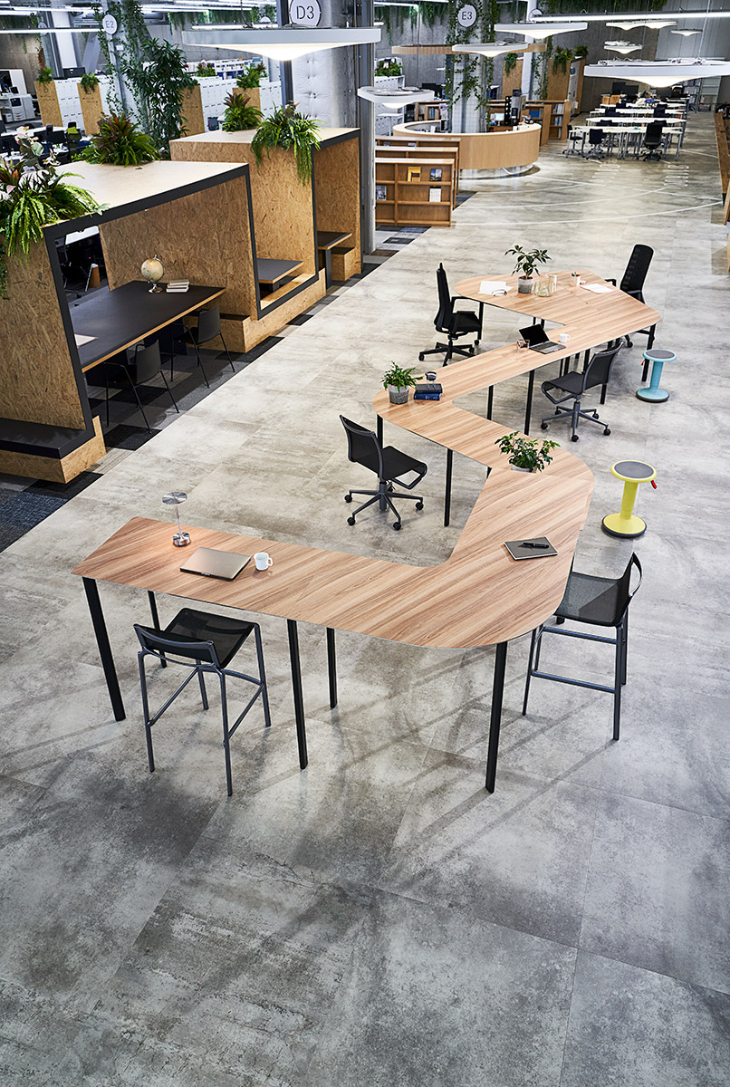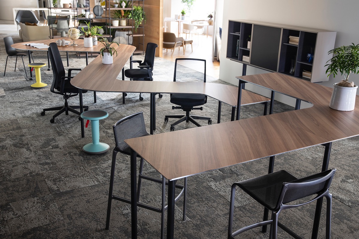 新しいRITMO CONNECT(リトモ・コネクト)システムテーブルは、四角や丸といった固定観念にとらわれず自由な形態で多様なオフィス環境にフィットします。