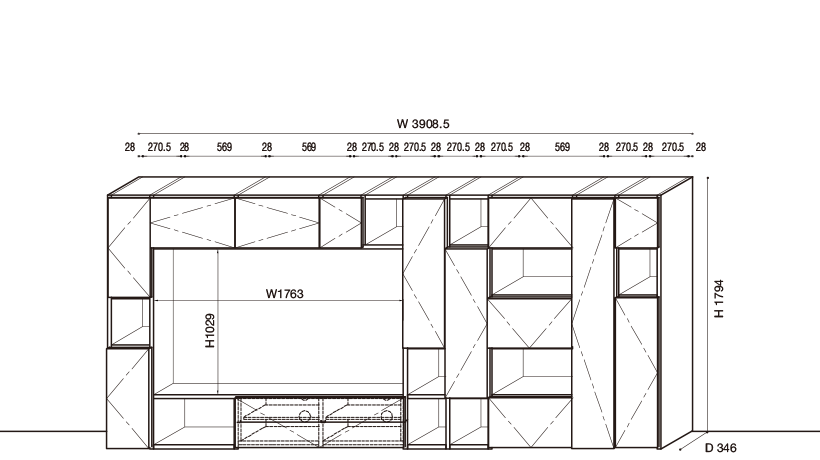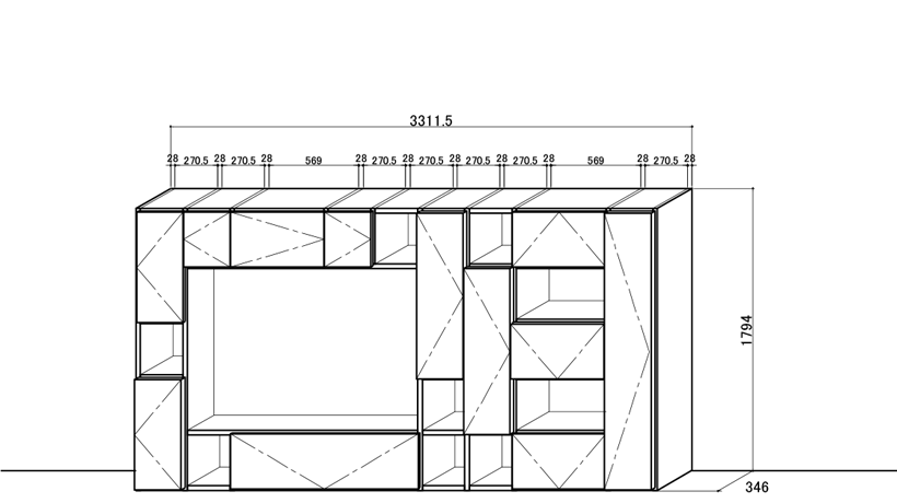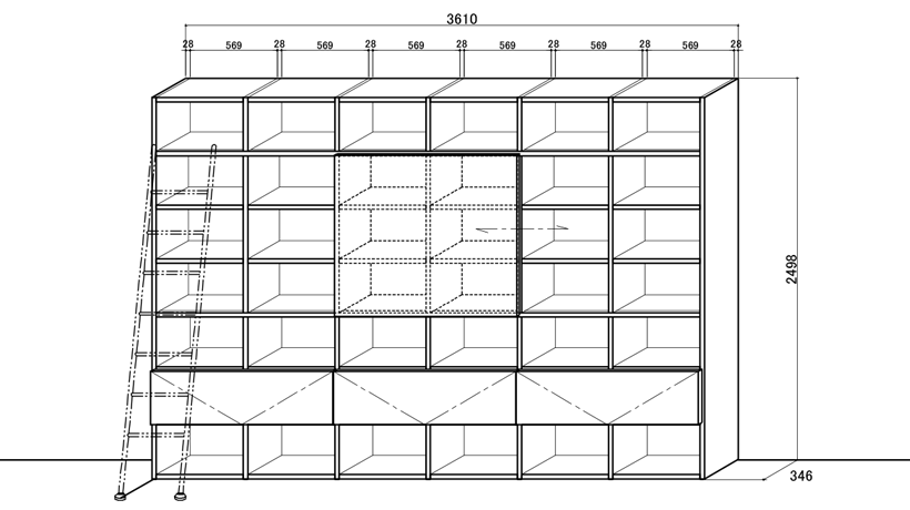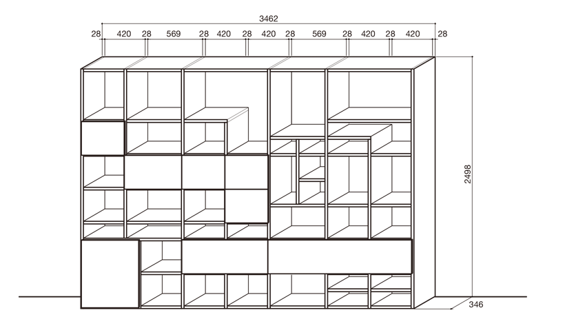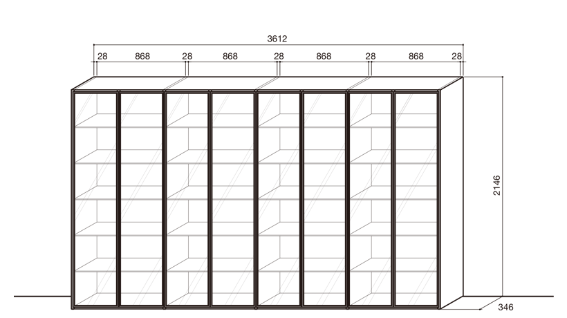 セレクタは奥行き(D)218 / 346 / 442mm のサイドパネルとシェルフで基本構成される、自立型収納ウォールユニットです。