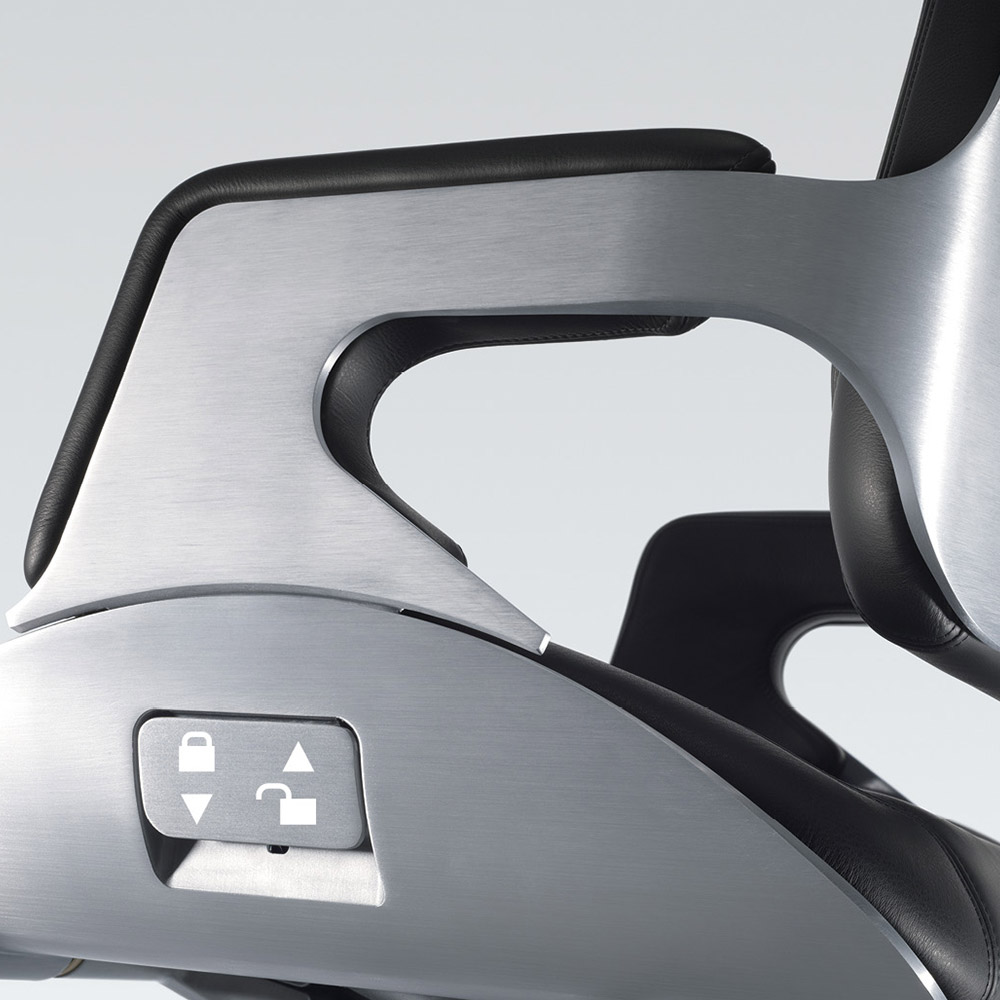 ユーザーの体格に合わせてリクライニングの強度調節が可能で、リクライニングの角度に応じてシート位置がベストポジションへと連動します。機能もさることながら、滑らかなカーブなどのディテールもすばらしく、デザインの美しさが際立ちます。