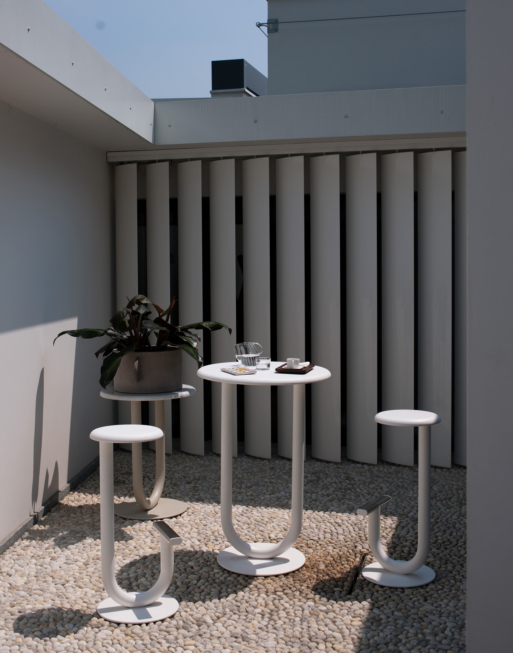 Eugeni Quitllet によるSTRONG コレクションのすっきりとしたデザインは、構造のコアとなるカーブしたスティールチューブが特徴的です。アルファベットのようなユニークな形状で、オフィスやカフェテリアなどのコミュニケーションエリアを機能的かつカジュアルに彩ります。屋外環境に対応できるよう加工を施したアウトドア仕様は、テラスなどのカジュアルで心地よい空間づくりに最適です。