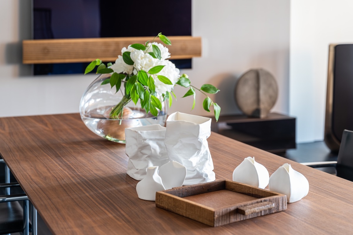 白・グレー・ブラックなどのニュートラルカラーに絞ることで小物が引き立ち、空間にコントラストが生まれます。 ミニマルでありながら、クラフト感のある有機的なラインが加わりアーティスティックな雰囲気を生み出します。