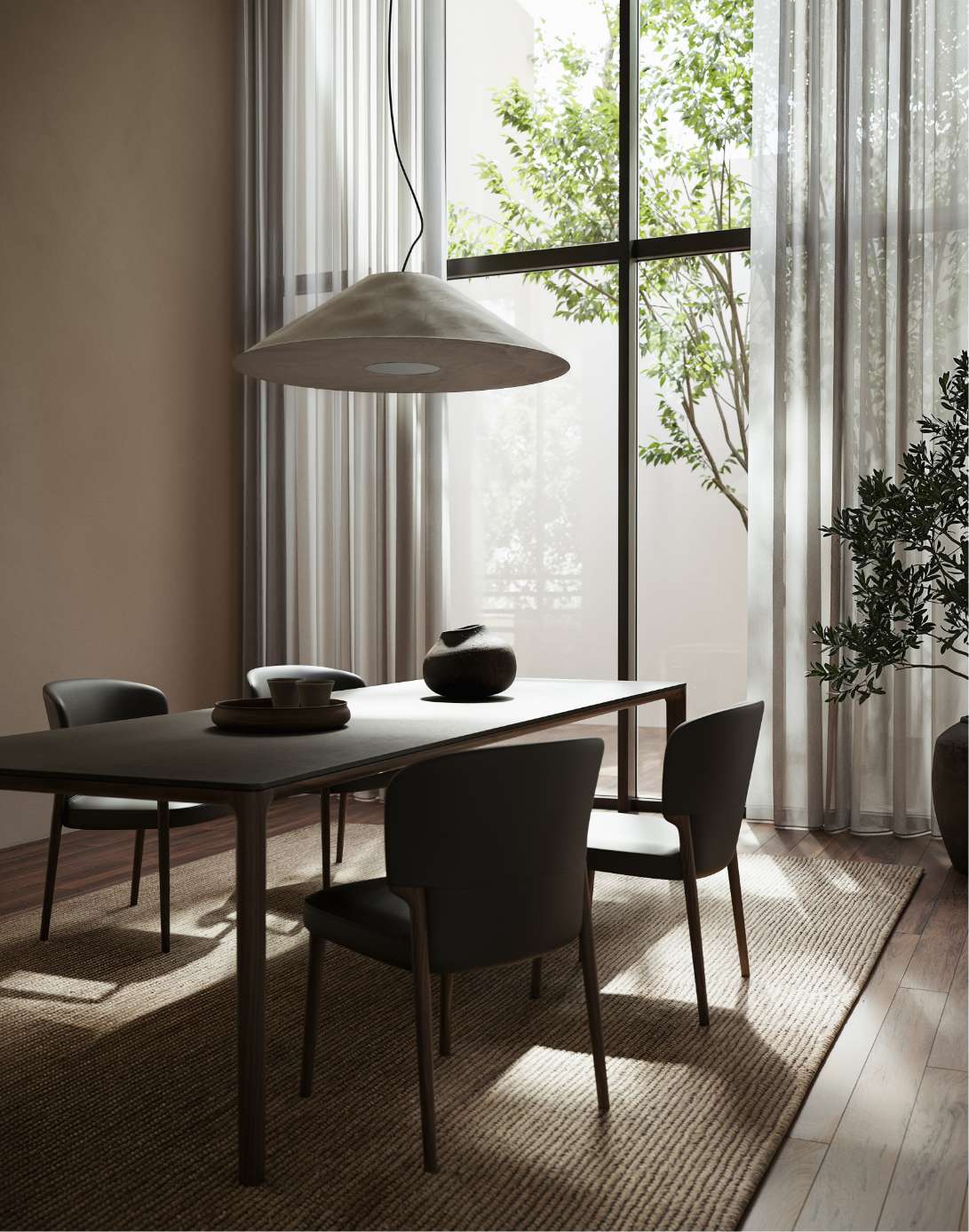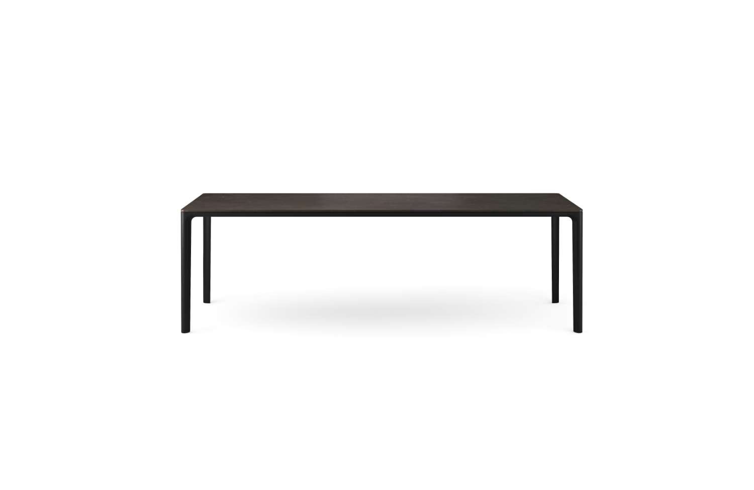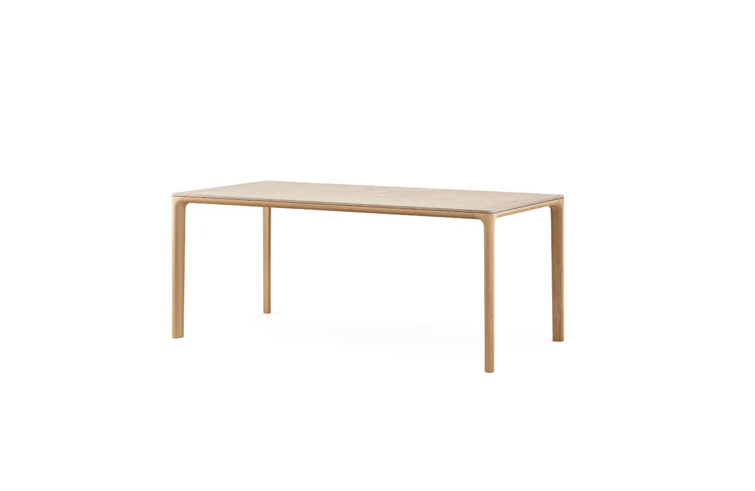 美しい木のディテールが特徴的な、4本脚のダイニングテーブル。天板のエッジは緩やかなカーブを描き、脚部とのつながりが滑らかで心地よいデザインです。 サイズは4つのバリエーションがあり、木材の種類は、オーク材ナチュラル、ブラックウォールナット材ナチュラル、アッシュ材ブラックの3種類からお選びいただけます。 天板は3種類のセラミックをご用意しています。