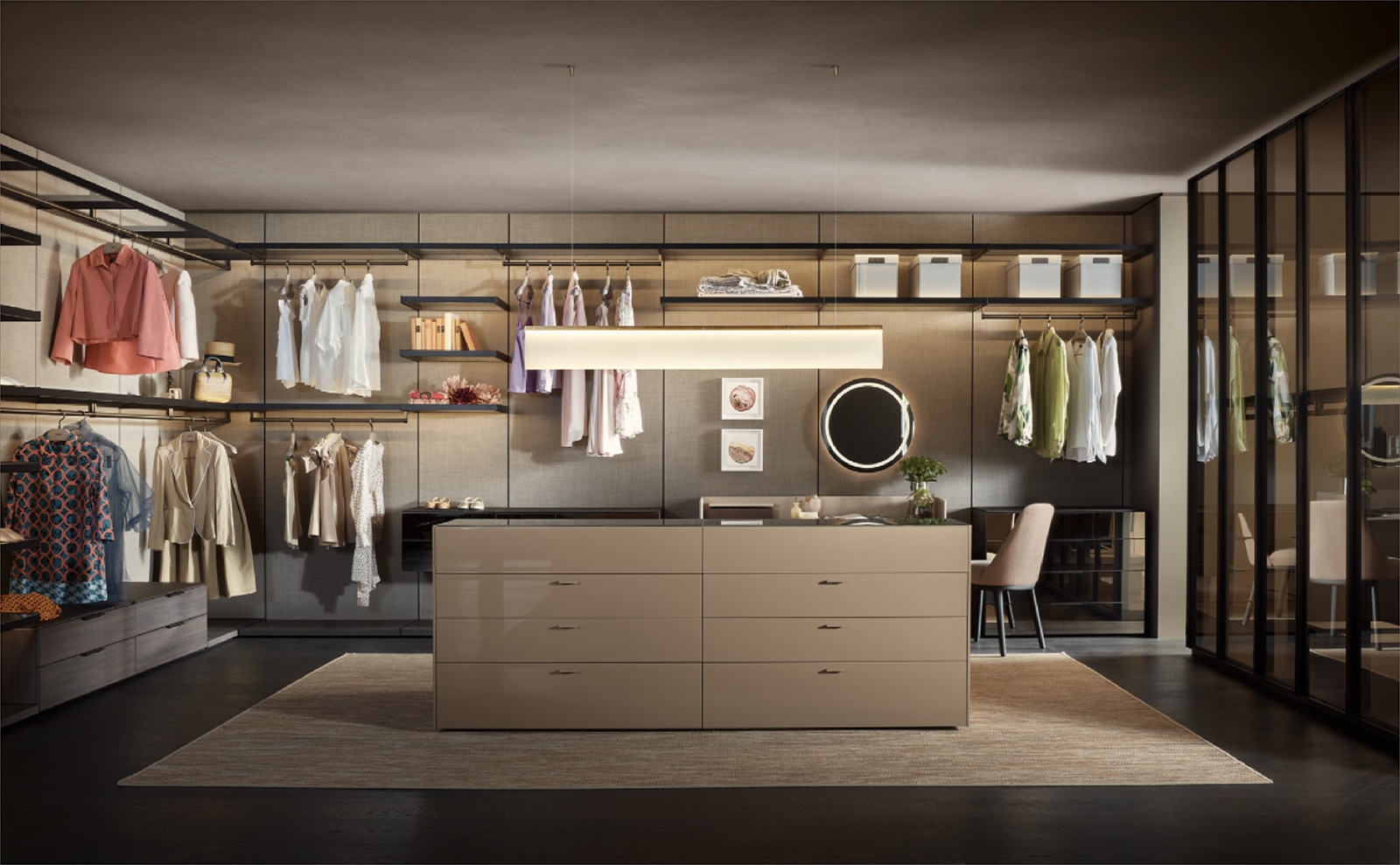 住まう人の個性を引き出す、オーダーメイドのウォークイン・クローゼット。色と素材のシンフォニーを奏で、空間を特徴付け、親密でオーセンティックな雰囲気を作り出します。VentiTreはLEMAの他のモジュール製品と組み合わせができるように設計されており、CENTIMETRO、LT40とも完璧に調和し、ニーズに応じていくつかのエレメントを挿入できます。シェルフの高さ変更が容易な、ケーブルレスのLEDランプシステムも搭載。ライフサイクルの終わりには簡単に分解できるように設計されており、各構成部品を適切にマテリアルリサイクルすることができます。