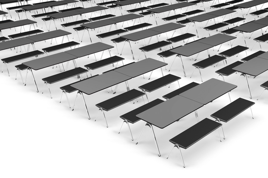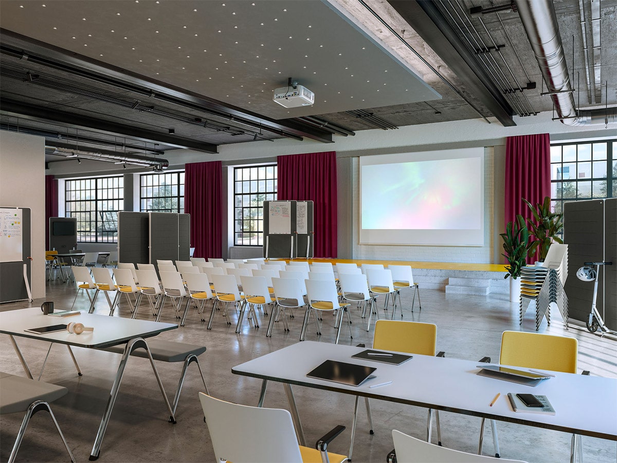 セミナールームやカンファレスホールに最適なソリューションをもたらす、インタースツール社のVLEGSシリーズ。その名の通りチェ アもテーブルも、楕円形のスティールフレームがV字の形状をしています。そのため、真上に向かって垂直にスタッキングしていくこ とができる、安定性と省スペースを叶えるデザインです。