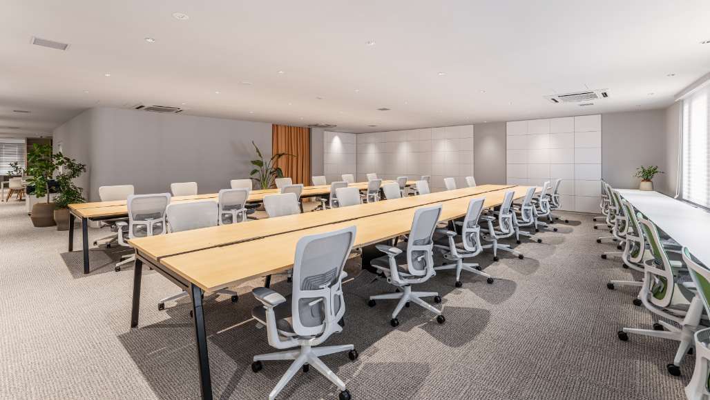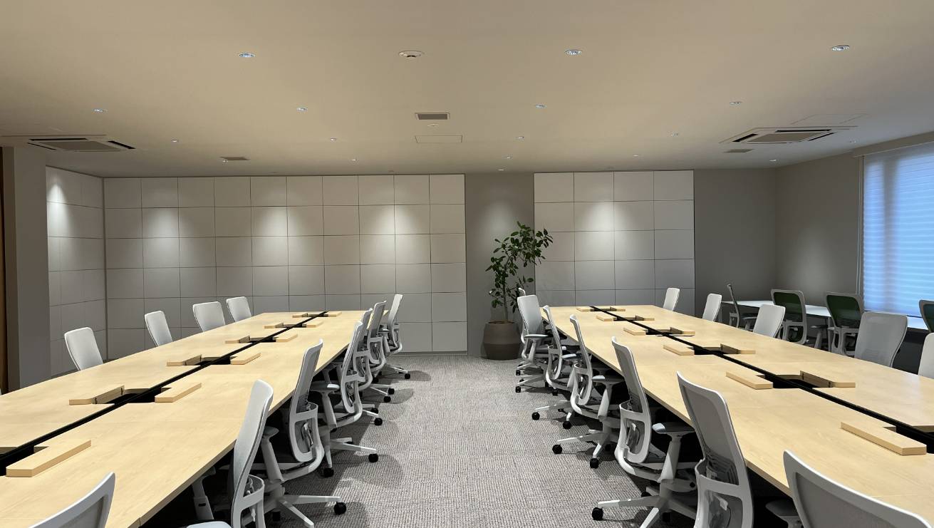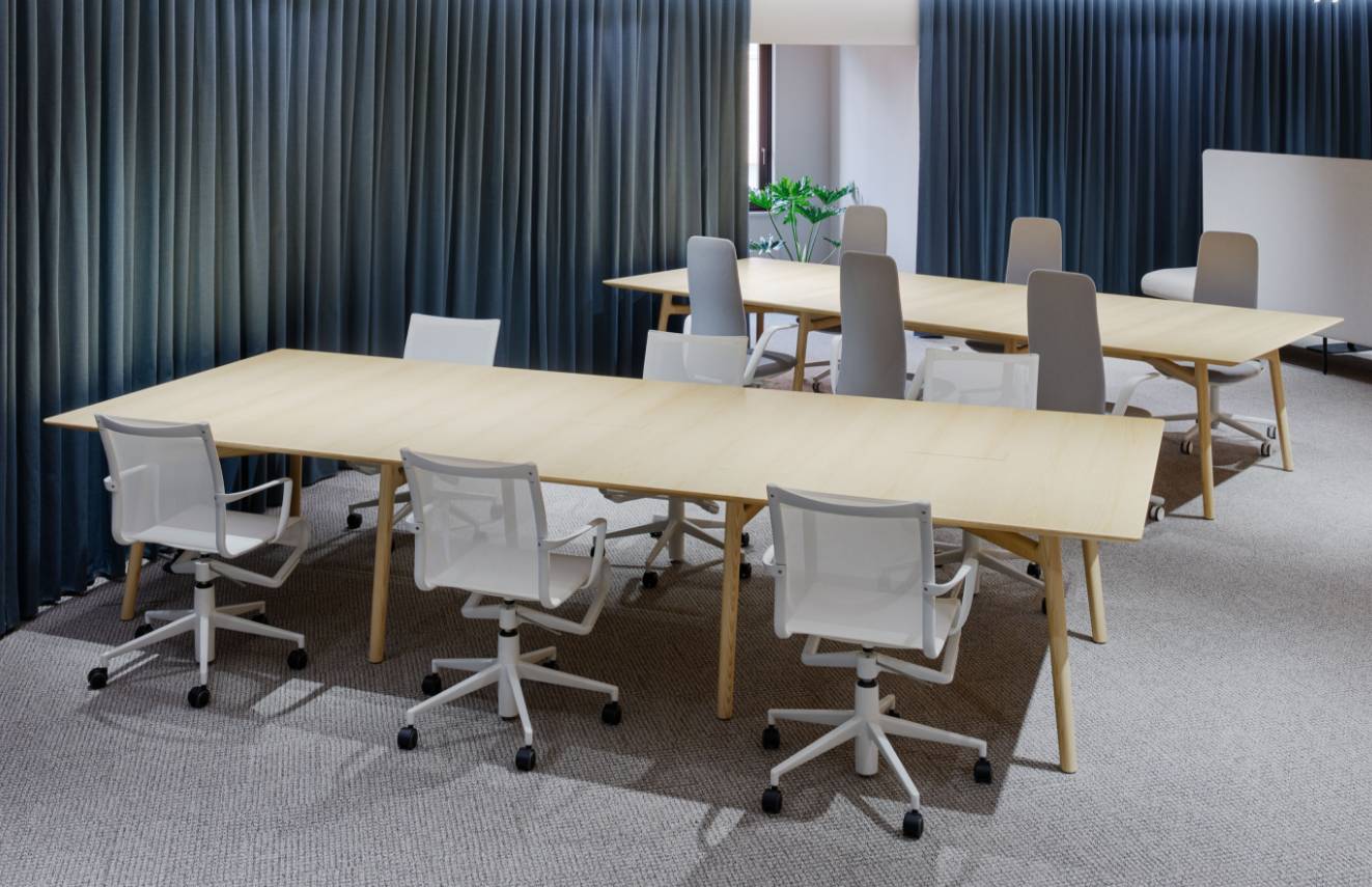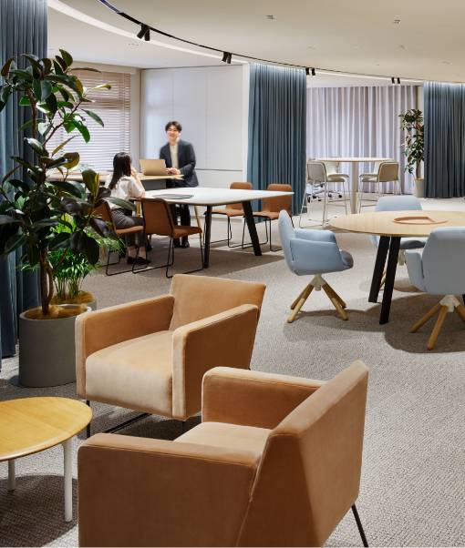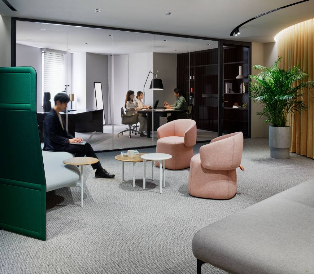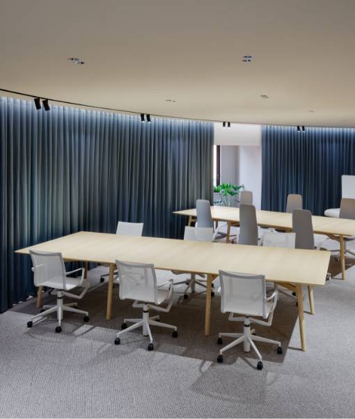 この曲線的なモチーフはオフィス全体に「流れ」と「つながり」を生み、