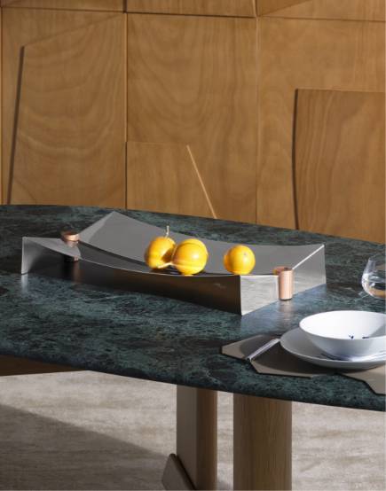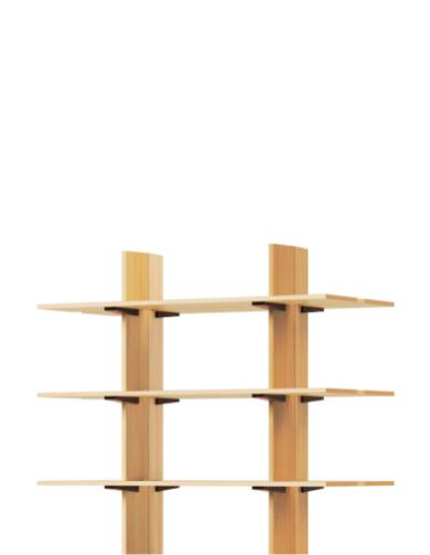 幾何学的で繊細なフォルムを持ち、異なる木目を活かしたパーツを組み合わせるモジュール構造により、1本の原木から素材を最大限に活用するサステナブルな設計を実現。熟練職人による緻密な手仕事が、木材本来の質感と存在感を引き立てます。