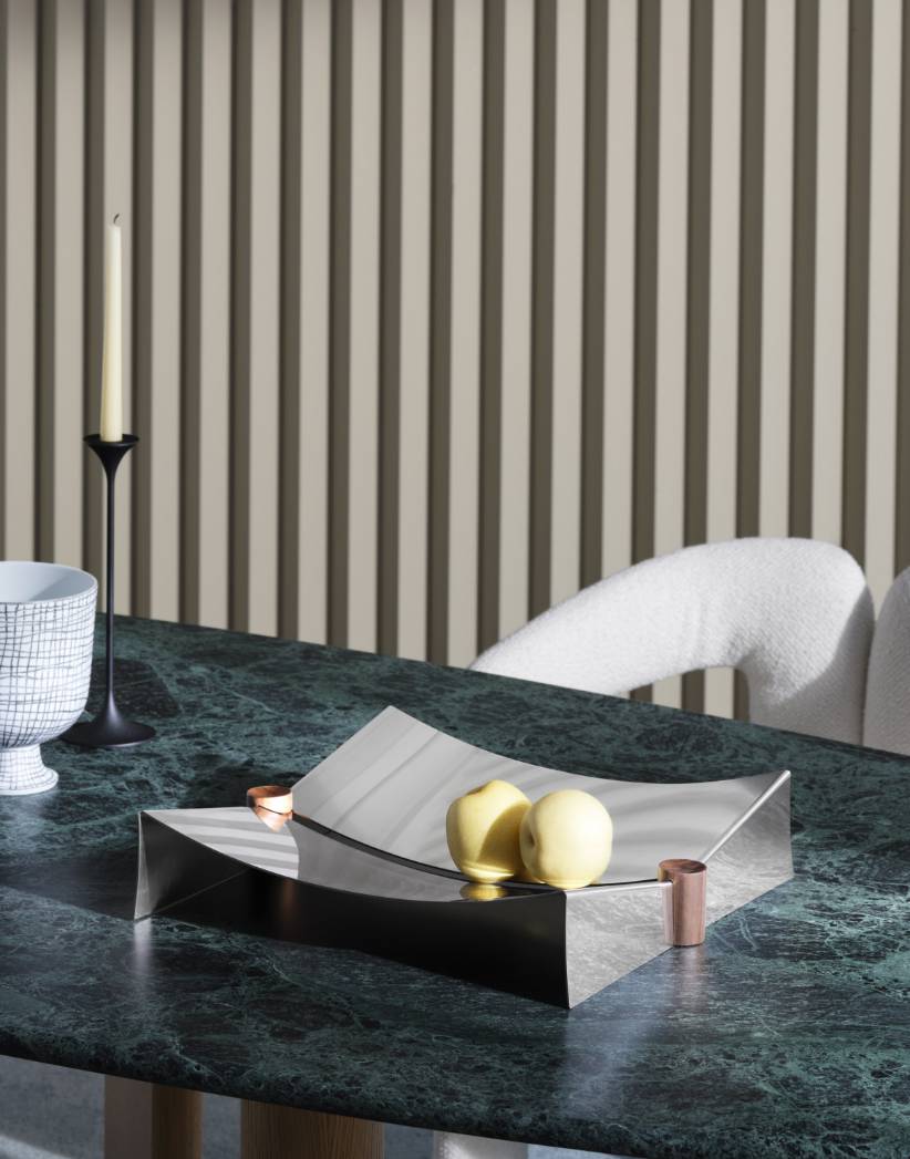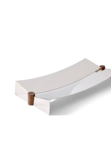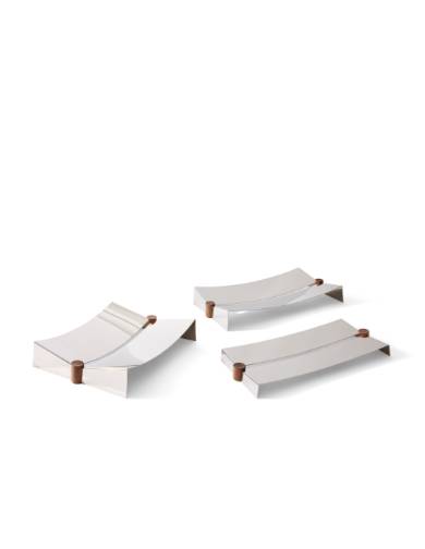 2種の長方形と1種の正方形、計3サイズのトレイで構成されたコレクション。わずかなラインで描かれるミニマルなフォルムは、しなやかで視線を惹きつける美しさを放ちます。