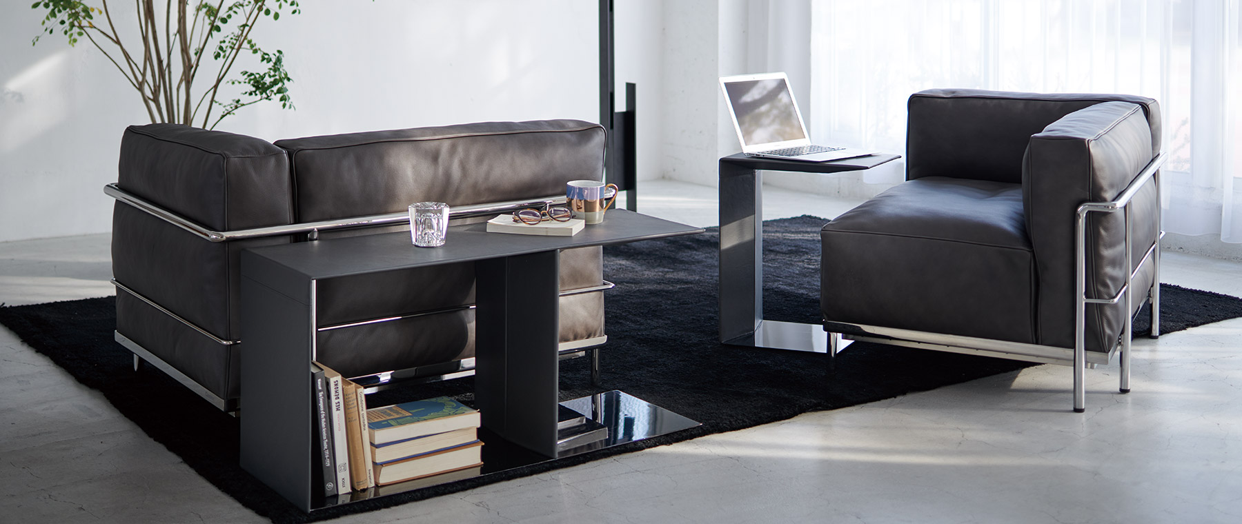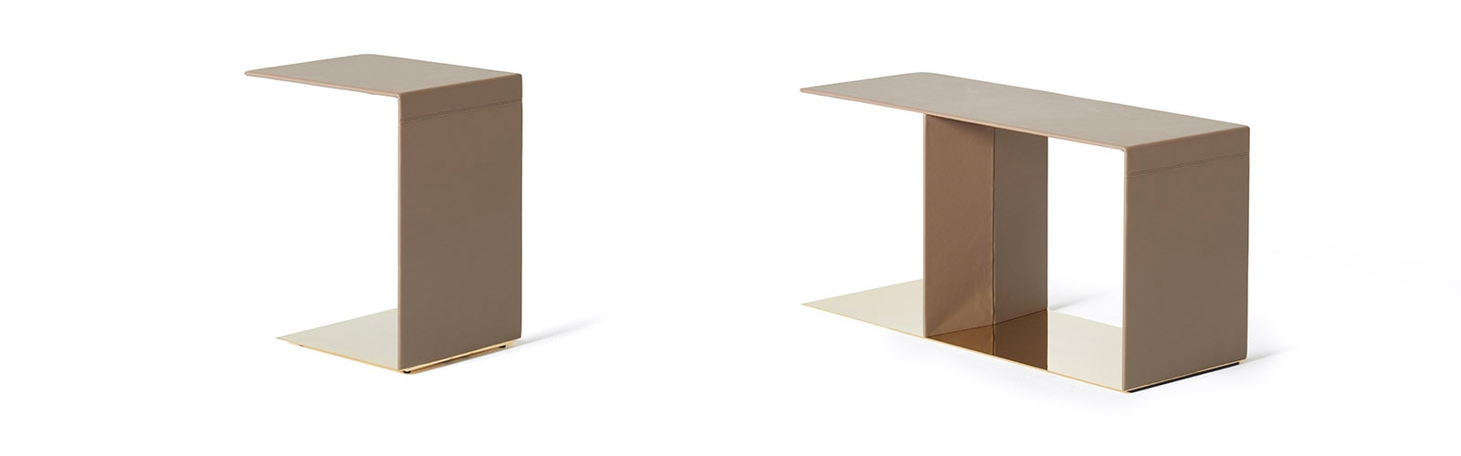 すっきりとしたシンプルなサイドテーブルですが、天板と側面がレザーに包まれ優雅な印象を与えてくれます。コの字型のテーブルはソファに差し込んで使用できるなど使い勝手がよく、コンテナベースタイプはソファサイドの低めのテーブル兼収納スペースとして活躍します。ベースの色はシャンパンゴールドとブラックニッケルの2色をご用意。レザーの張り込み部分はソファと同様のixc.オリジナルレザーからお選びいただけます。