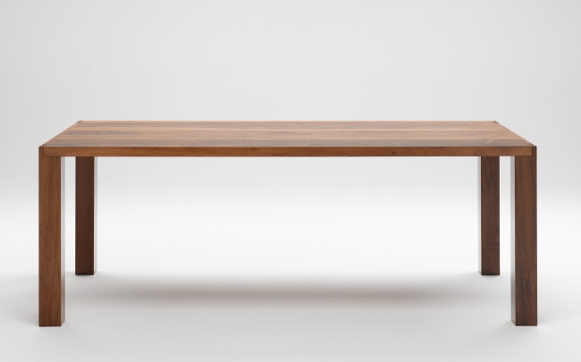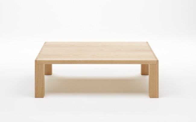 テーブルは、天板の縁と脚部に無垢材を使用しています。脚部との接合部分は無垢材の断面を敢えて見せるようにデザインされ、さらに木を組む形状にすることで天然木の良さが表れています。一方、天板の中央部分には突板材を使用し、樹種によって突板の枚数や貼り方、木目の選び方を変えています。色や木目をきれいに合わせすぎないことで自然な木の雰囲気を引き出しています。90mm角の太めの脚部に対し、40mm厚というやや薄めの天板とのバランスは、素材の質感も相まって重厚でありながら軽快感のある印象です。