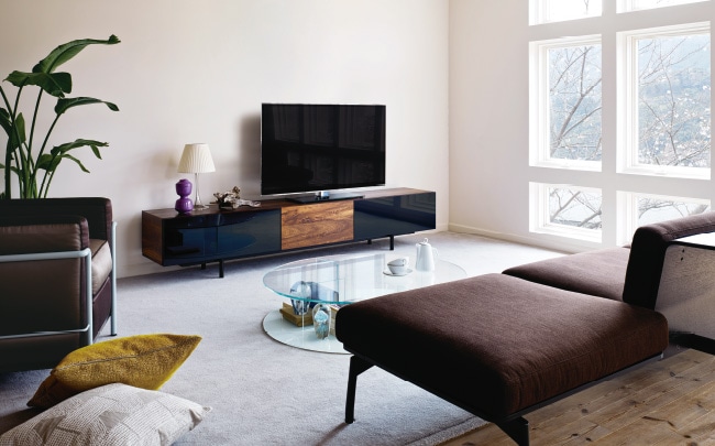 シアターボード木の素材を活かしつつ、テレビの黒い画面ともマッチするシャープでフラットなガラスドアデザイン。丸く細い脚部により、ボックスが宙に浮いているかのような印象を与えます。前面のダークミラーガラスはドロップダウン扉を採用し、中の収納物は隠しつつ、扉を閉じたままでもリモコンによる操作が可能。扉はソフトクローズを採用し、その動作にもしっとりとした高級感が感じられます。インナードロアーは、ノートPCやタブレット、スマートフォンを充電しながら収納ができるようにワイヤリングが考えられており、本体背面の脚部についた配線ラックは乱雑になりがちなコード類を美しくまとめられるよう設計されています。 > 商品ページはこちら