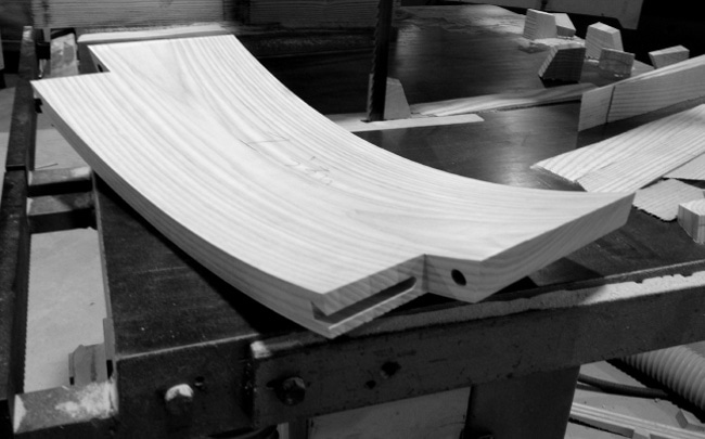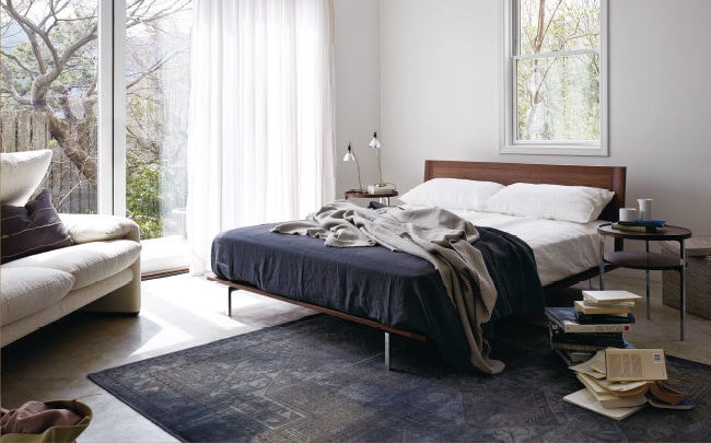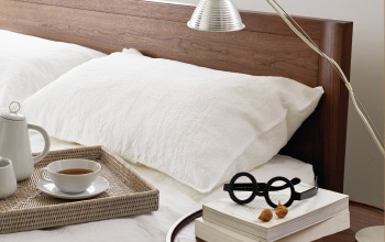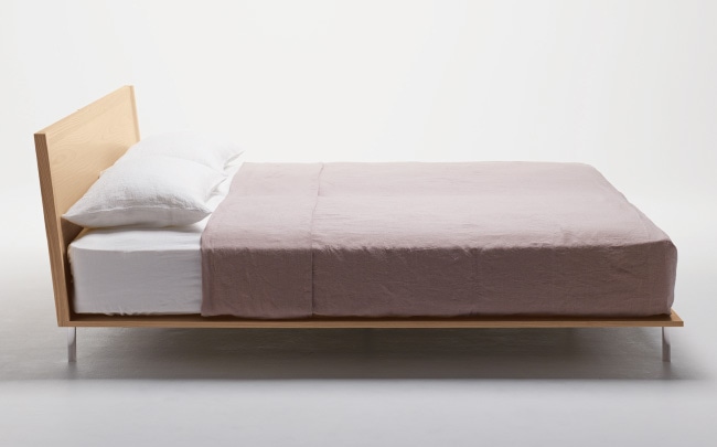 適度な傾斜のヘッドボードは縁に無垢材を使用し、外側に向かってて人の体に寄り添うような