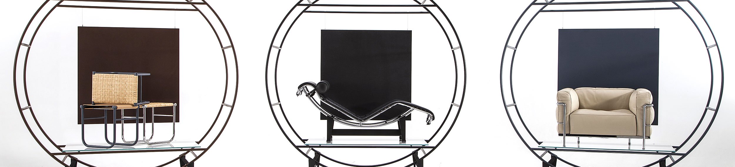 パリのグラン・パレで毎年開かれるサロン・ドートンヌは、1929年、ル・コルビュジエ、ピエール・ジャンヌレ、シャルロット・ぺリアンが<Equipement interieur d’une habitation(住宅のインテリア設備)>を発表した記念すべき展示会でした。今でこそカッシーナが製造販売を行っているアイコン的な金属製チューブの家具ではありますが、当時3 人が初めて公の場に装飾的要素を排除したミニマリストなこの作品を発表した際には、その奇抜なスタイルゆえ多くの物議をかもしました。