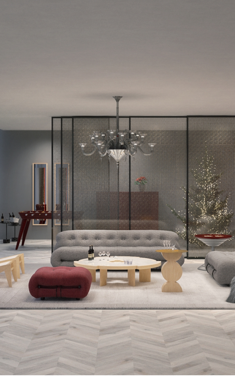 グログランテープで縁取られた輪郭がエレガントな装いのシステムソファ<DRESS-UP!>。アシンメトリーなラインが生まれるモジュールを組み合わせ、自分だけの個性を表現できます。ホリデーシーズンはゴールドカラーのクッションを追加していつもよりきらびやかに飾り、会話だけでなく時にはボードゲームを楽しみながら親交を深めるきっかけに。