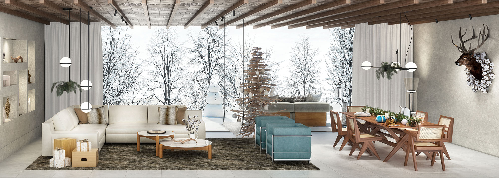 ごろりと寝転ぶのに十分な広さを提供する<MISTER>システムソファ。硬めと柔らかめ、2種類の中材から好きな方を選ぶことができる機能的な面も。自然が似合うこの部屋には、ナチュラルな雰囲気のツリー、小動物のようなエコファーのクッション、クリスマスらしいグリーンのテーブルアレンジがぴったりです。