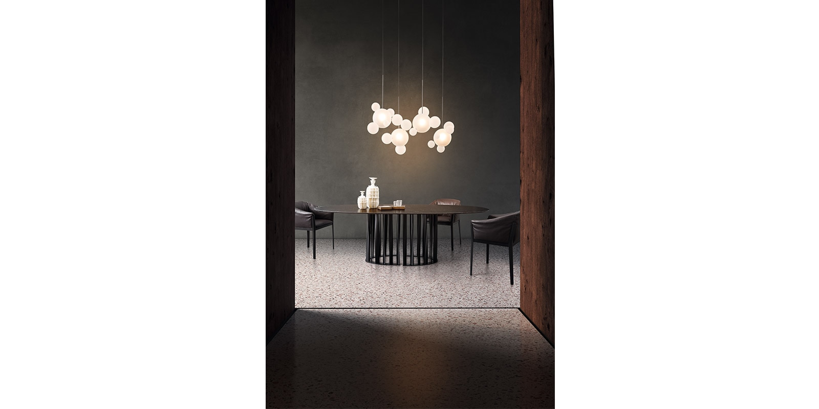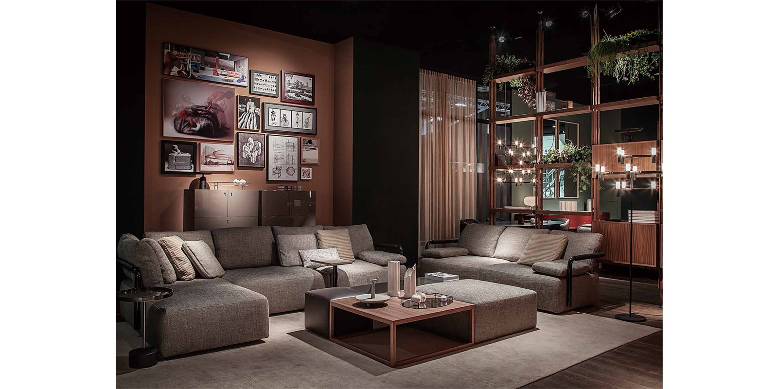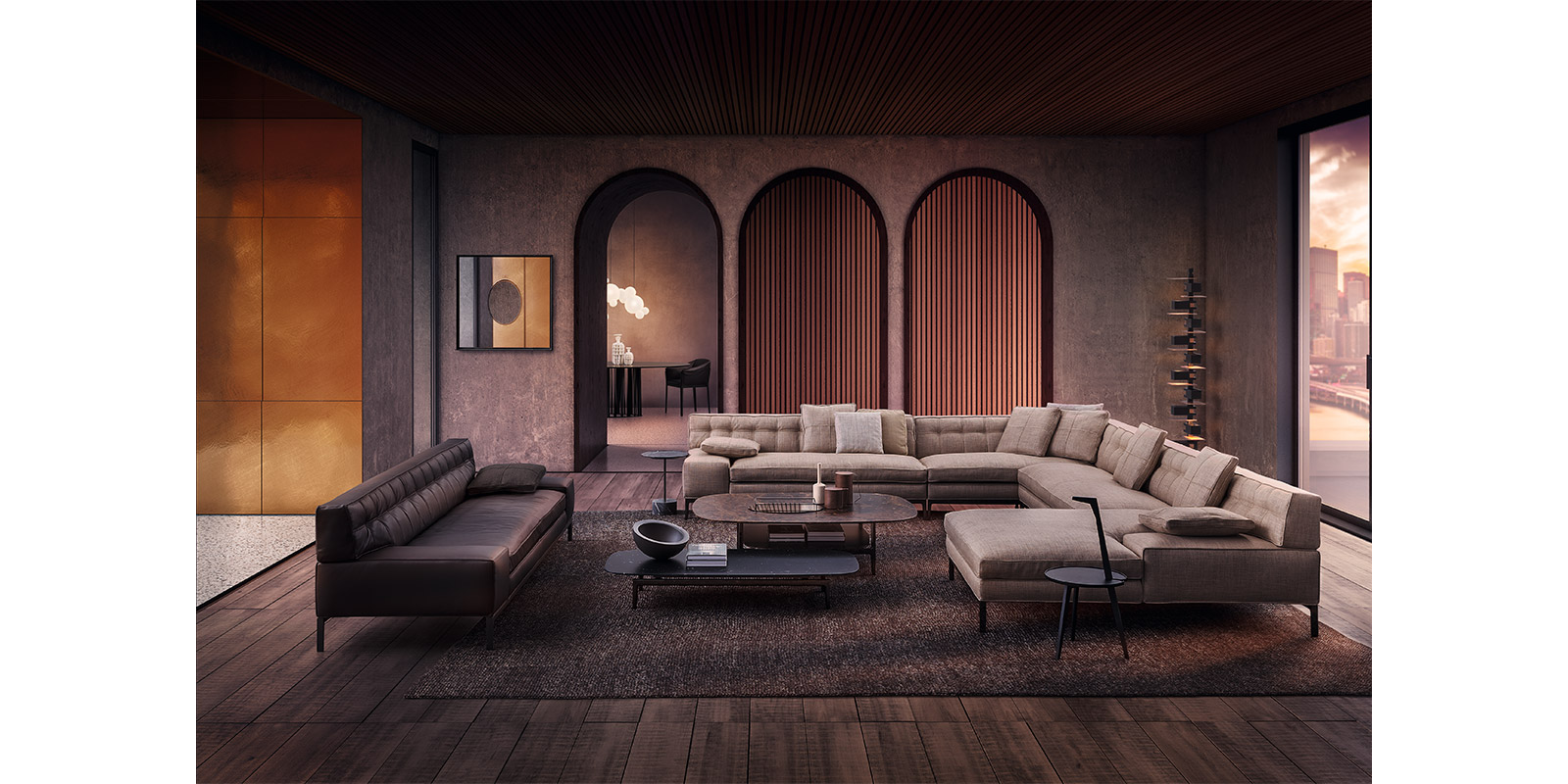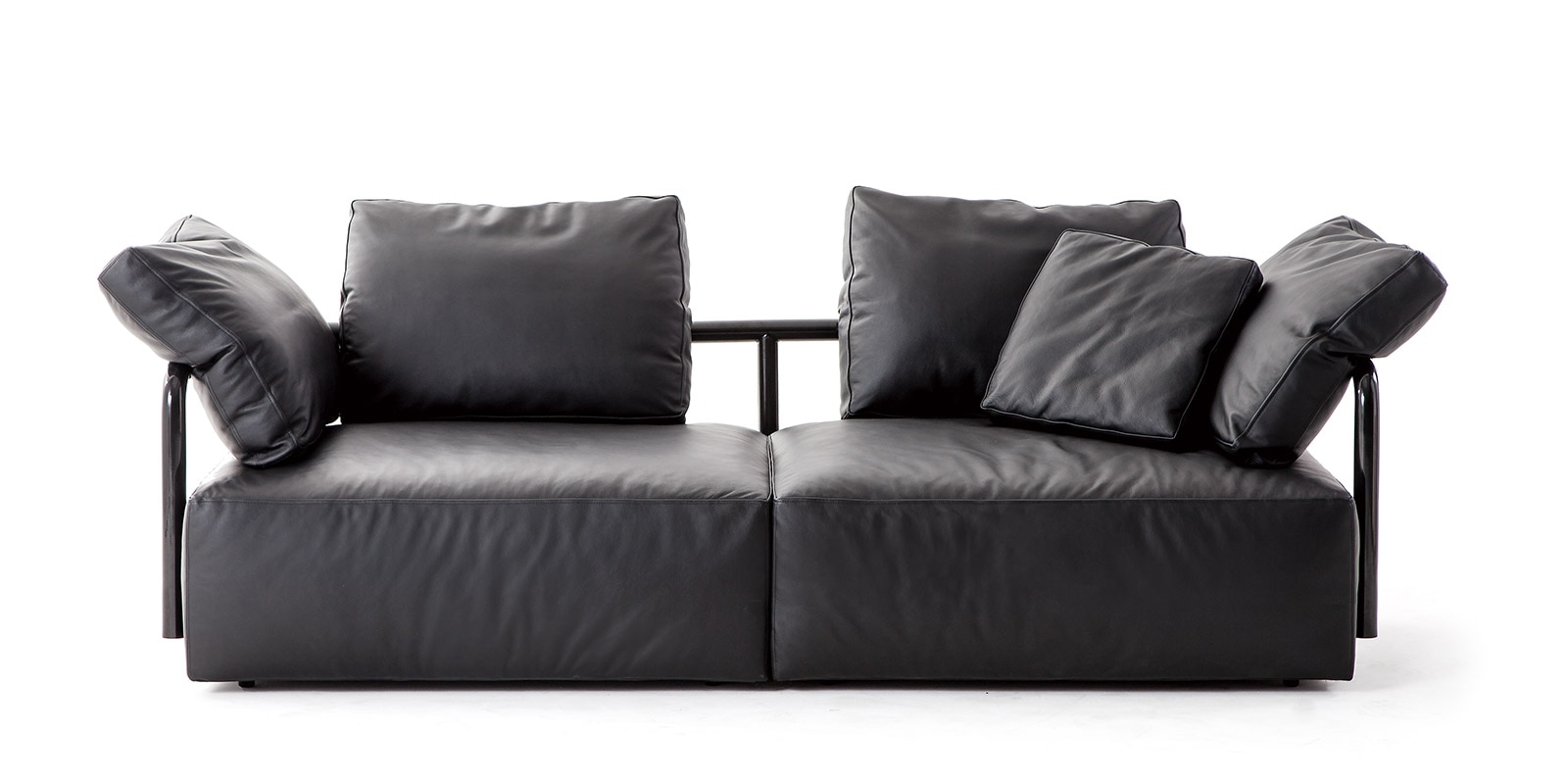 「使い手のニーズに合わせてスペースを定義する」というコンセプトから誕生したモジュラーソファ。ソファの背の一部となるチューブ型のフレームは、フランコ・アルビニがデザインしたミラノ市内地下鉄駅構内に見られる手すりや、1950年代にカッシーナが内装を担当した豪華客船のレールを想起させます。この建築的なエレメントがテリトリーを区切り空間の中に新たな空間を定義する境界線を作り出す一方、ソファの内と外に明確な区別はなく、人々が集まりやすいコミュニケーションエリアを創出してくれます。