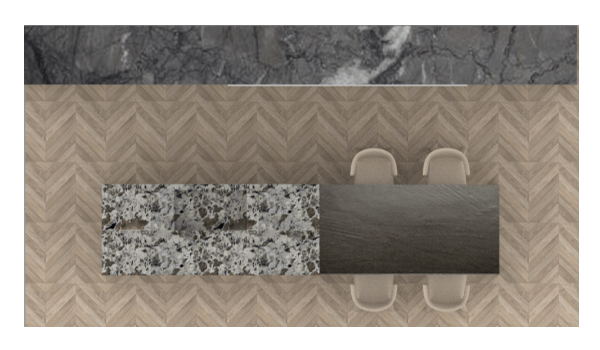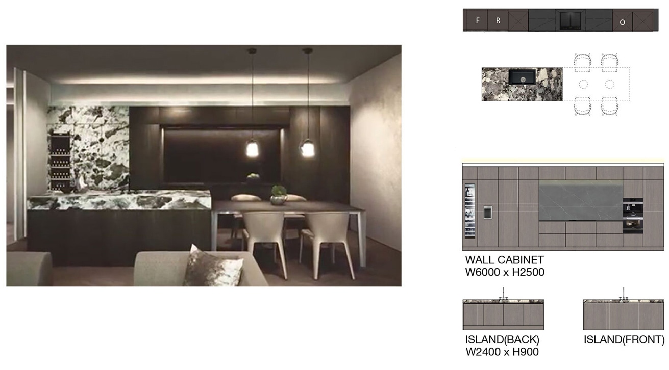 部屋の中と窓の外の景色を一度に見渡せるキッチンは、いちばんの特等席。ドイツのキッチンブランドSieMaticによる、天然石のワークトップをアクセントにしたラグジュアリーでミニマルなアイランドキッチンと美しく整えられたバックセットは、この空間のためだけに設えた唯一のキッチンです。アイランドから伸びるようにセットされたダイニングテーブルをはじめ、シンプルな家具やキッチンの中で有機的な形のペンダントライトがアイキャッチになります。