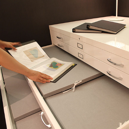より一層気軽にアートに親しんでいただけるよう、2013年7月より始まった「ARTE ANELLO(アルテ・アネッロ)」は、カッシーナ・イクスシー直営店にて200点程のシート状のアートをお客様にご覧いただき、その場でお好みの作品をお選びいただけるサービスです。