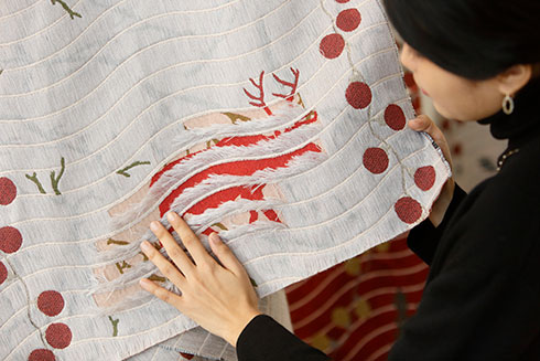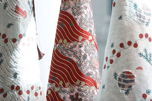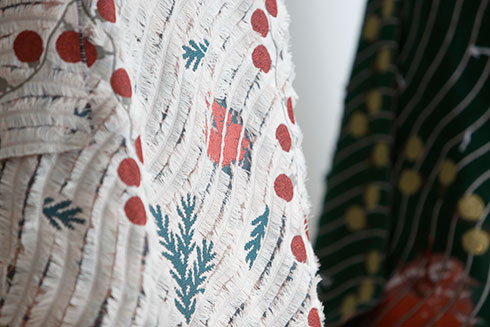 - 布と人との関係性には、たたむ、まとう、縫うなどいろいろなアクションがありますが、使い手が布の表面にハサミを入れて柄を完成させるというのが、『snip-snap』の特徴で、2013年に発表しました。