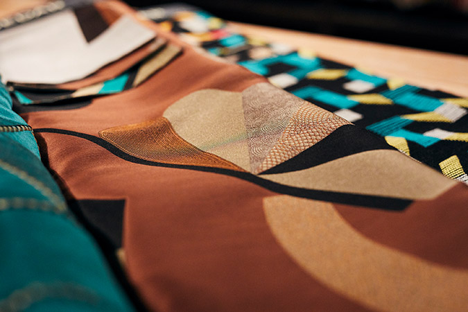 - 2017年の新作はかつてないほどにビジュアル表現とテキスタイルアートの関係性を明確に示しております。ビジュアルに訴える表現とテキスタイルの芸術性はいずれもDEDARのノウハウの結晶として我々のメゾンの差別化の源泉となっています。今年は特にそれがジャカード織で体現されてました。例えば、特徴的で幾何学的なプリントと50年代の抽象画の世界を「Pachisi(パキージ)」というウールコットンのファブリックで実現しました。これは様々なブレンドと異なる太さを持つ糸を非常に複雑な生産工程を経て作り上げられた秀逸なファブリックです。