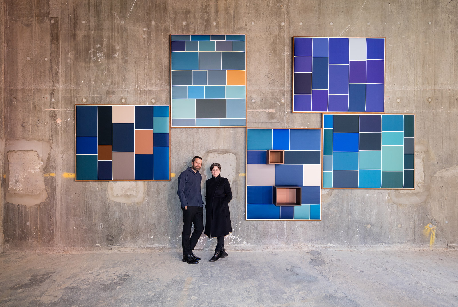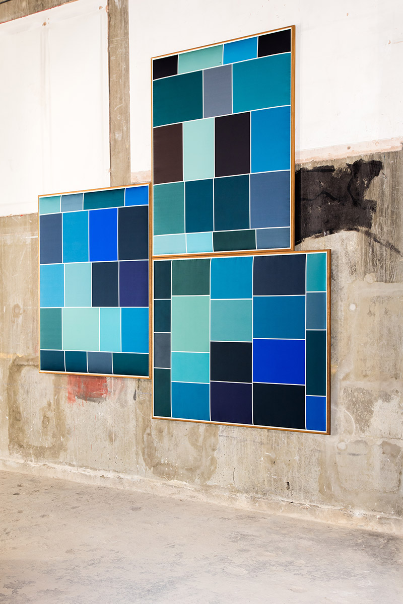これらの作品はマルティノとブリジットが「ブルー(青)」を使ったことで知られる著名画家イヴ・クライン、ピカソ、ヴァンゴッホ、ジオット、マティスなどの画像検索をし、検索結果を待っている間に表示されたパターンをスクリーンショットで撮り、DEDARの Tabularasaファブリックにデジタルプリントしたものです。