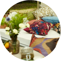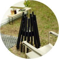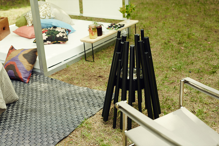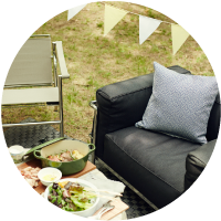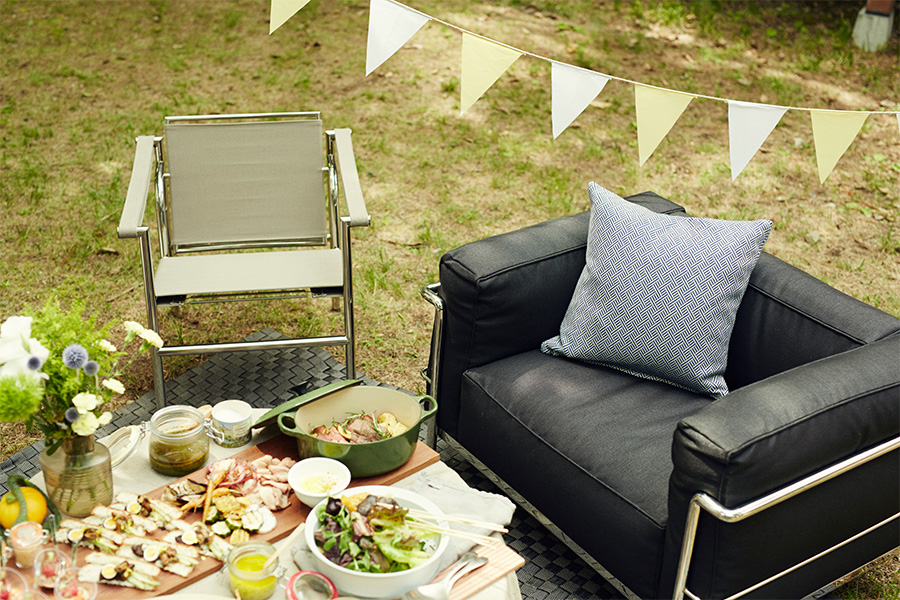 テーマは、地元・軽井沢の食材を味わうカジュアルなおもてなし。ゲストとの時間を大切にしたいから、料理はプロの手を借りてケータリングを活用しました。テーマに合わせて、器はナチュラルな素材のものを中心にセレクト。テーブルには、ビンテージな風合いを持つリネンのクロスをラフに合わせ、ゲストが自由に移動できるように、アウトドアチェアやデイベッド、ラグをランダムに配置しました。ゲストもホストも思い思いの場所に座り、舌鼓を打ち、語り合う。心解きほぐれる時間が、ゲストとの距離をさらに近づけてくれます。