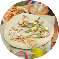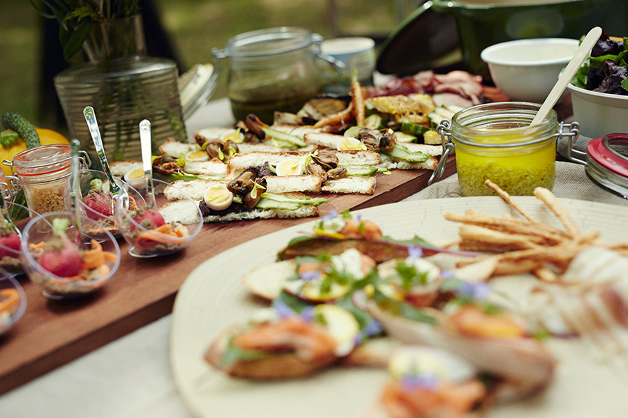 パーティーのテーマを踏まえ、料理はフィンガーフードを中心に、ラフなスタイルに。軽井沢の空気や季節感が感じられるように、近隣で収穫された新鮮な夏野菜やハーブ、信州サーモンなど地元の食材をたっぷりと使って頂きました。選び抜かれた食材が織りなすのは、舌にも記憶にも残る深い味わい。プロならではの完成度の高いプレゼンテーションに、ゲストの顔がほころびます。