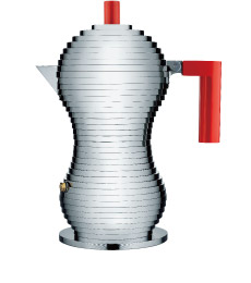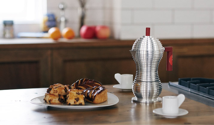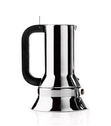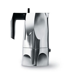 リチャード・サパーのデザインによるALESSIのエスプレッソコーヒーメーカー「9090」。ワンタッチ着脱式のハンドルを持ち上げるだけで、簡単にボイラー(お水を入れるベース)とフィルター(コーヒーを入れる器)に分解することができます。