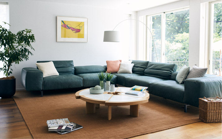 たとえば、L字型に大きく組めるソファSCIGHERAを夏らしいグリーンの張地に変えるだけでも、イメージががらりと変わります。サラリとした上品な質感のラグATACAMAに、涼しげな白の大理石を天板に使用したテーブルRIOをコーディネートしてみました。アウトドア用の生地で作ったクッションは、白系の中にアクセントとなる赤を入れるのがポイント。クッションとともにテラスとリビングを行き来して楽しむアクティブな空間を作り出します。