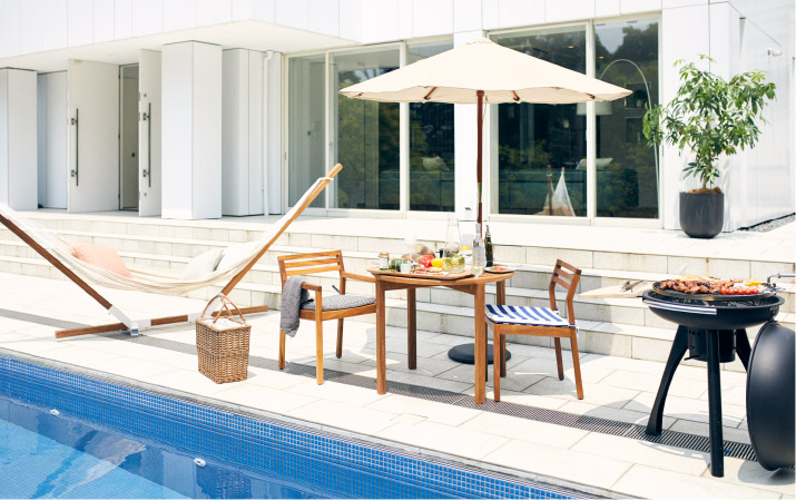 リビングから続くテラスにセットしたアウトドア家具のテーブルとチェアPRATO。木の美しさをそのまま残しつつオイルフィニッシュ仕上げをした質感は、プールサイドにも芝生のグリーンにもよく合います。もちろんこれだけでも様になりますが、コーディネートに少し手を加えれば、家にいながらバカンス気分がさらに盛り上がります。