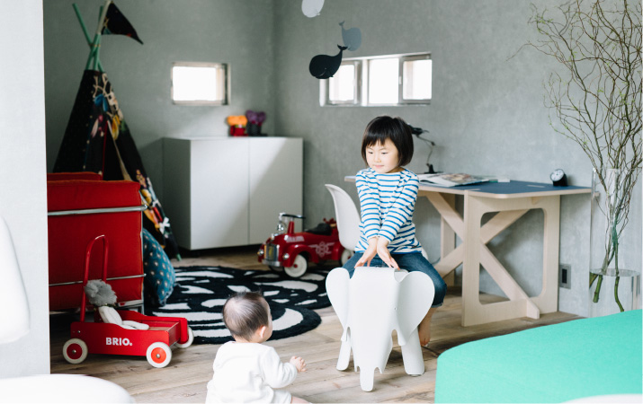 小さい子どもがいる家庭では、ゲストを家に招く機会が増えます。でもゲストが遊びに来るたびに気になるのが、子どもがいる家ならではのインテリアの悩み。たとえば、部屋のあちこちに散らかったおもちゃや、お気に入りの家具と子ども用家具のミスマッチなど。あるいは、動きまわる子どもから目が離せないため、ゆっくりおしゃべりができないなんてこともあるかもしれません。子どもがいても、スマートにおもてなしをしたい。ゲストと会話を楽しみたい。そんな思いを叶えるために、大人にとって居心地の良いインテリアでありながら、子どもも楽しく遊べる空間づくりを考えました。