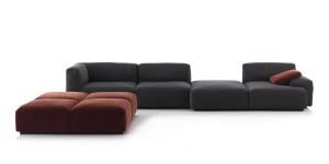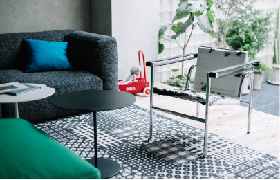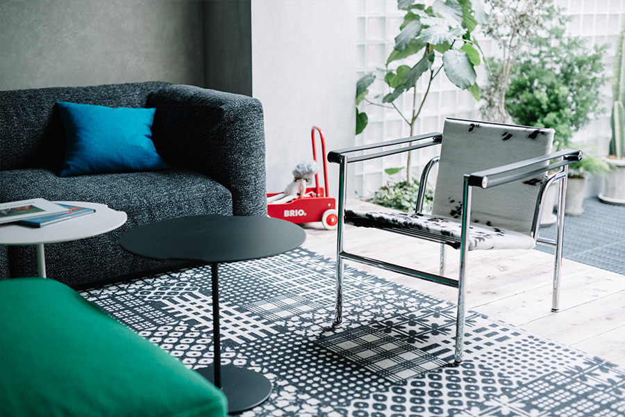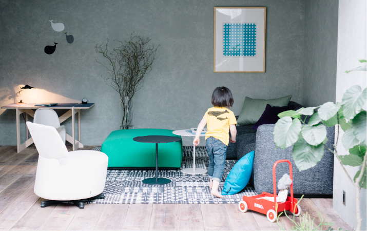 リビングの要となるソファには、座面が低く、大人も子どももゆったりとくつろげる「MEX CUBE(メックスキューブ)」をコーディネート。張り地は、汚れが目立ちにくいグレートーンのファブリックを選びました。システムソファなので、シートを追加して組み合わせの変更を楽しめるのが魅力。子どものお友達が遊びに来た場合も、オットマンをソファにつけるなど、即席で子どもの遊ぶスペースをつくることができます。 シックなテイストのソファに遊び心を加えるのが、ヴィヴィッドなグリーンが目をひく「MEX CUBE(メックスキューブ)」のオットマンと「K06 AKI BIKI CANTA(アキ、ビキ、カンタ)」のラウンジチェア「AKI(アキ)」、パッチワークが印象的なスウェーデンの老舗ブランド「KASTHALL(カスタール)」のラグです。子どもが好む色やポップなアイテムをバランス良く散りばめることで、子どもの存在が感じられる雰囲気にまとめました。それぞれテイストの異なる家具で構成されていますが、ソファやサイドテーブル、ラウンジチェアなどに丸みのあるフォルムを選ぶことで、全体として調和のとれた空間に仕上がっています。