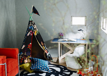 リビングにいながら子どもを見守ることができるように、部屋の一角に設けたのは子ども用のスペース。子どもが自由に行き来できるように、リビングとの間仕切りはつくらず、ひとつづきの空間にまとめました。デスクは「コン ドット テンポラリー・ファニチャー」。チェアは70年代の名作、パントンチェアの子ども向けサイズをセレクト(取扱い:ザ・コンランショップ)。子どもの好奇心を刺激するのは、ママお手製のテントや落書きをモチーフにしたラグ。リビングと同じ「KASTHALL(カスタール)」のラグをコーディネートすることで空間のトーンを合わせました。子どもにこそ知ってほしい名作家具