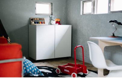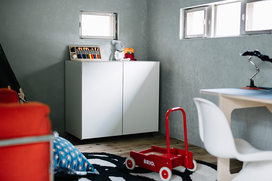 散らかりがちな子どものいる空間をすっきりと片付けるためには、専用の収納スペースを確保すること。キャビネット「LOTUS(ロータス)」は、あらゆる空間にフィットするシンプルなデザインで、リビングから続く子どものスペースも、スタイリッシュな印象に引き締めます。スチール製で汚れを落しやすい点も子ども用の家具に外せないポイント。キャスターが付いているので、子どもの成長に合わせた模様替えにも重宝します。