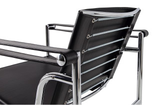 一見しただけでは、「座りにくそうな椅子」という印象を持たれがちな一脚かもしれない。スチールパイプのフレームは硬質で、座面や背もたれも薄く、精悍なプロポーションは快適さを犠牲にしているように見える。しかし実際に腰かけると、そんな印象は雲消霧散する。背もたれは左右各1点のみで固定され、姿勢に合わせて自在に角度を変化させる。座面の裏側にはスプリングがあり、十分なクッション性をそなえている。レザーのベルト状のアームレストも、素材のもつ弾力がほどよい。20世紀を代表する近代建築の巨匠、ル・コルビュジエがその事務所の所員と完成させた「1 FAUTEUIL DOSSIER BASCULANT」には、彼の建築に通底する、人間を中心とする思想が鮮やかに発揮されている。