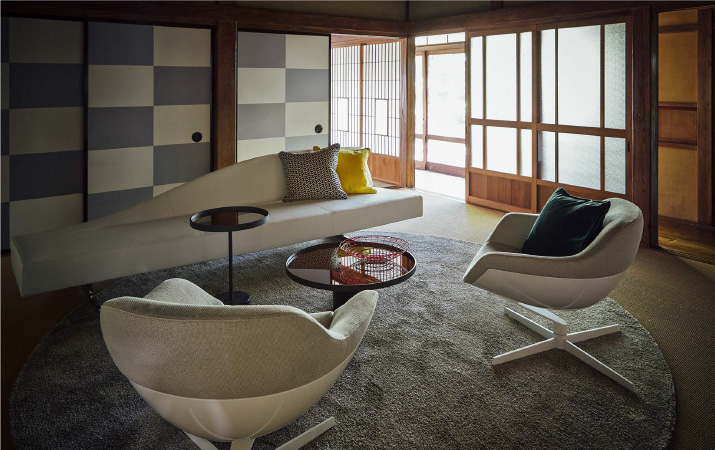 まずは、家族や気のおけない仲間が集い、わいわいと会話やコミュニケーションを楽しむ空間であるサロンのコーディネートをご紹介しましょう。サロンには、曲線が美しいソファ、テーブル、チェア、ラグを選んでみました。格子模様など日本家屋の直線的なしつらえに曲線を組み合わせることで、有機的な空間が誕生します。積み重ねてきた時間が醸し出す控えめで奥ゆかしい空間に、ジャン・マリー・マッソーのソファやチェアが優美にそして饒舌に語りかけてくる……そんなコントラストが、にぎやかなサロンの雰囲気を、さらに盛り立ててくれることでしょう。