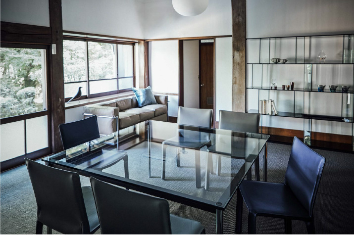 ゲストをもてなす応接間は、シンプルで研ぎ澄まされたデザインのソファとテーブルで組み合わせてみました。畳に格子という和の空間に、洋の家具がしっくりと馴染んでいるのは、どんな空間にも合わせられる普遍性を持つソファの2 FAUTEUIL GRAND CONFORT, PETIT MODELE、自然からインスピレーションを得て作られたペリアンのREFOLO、日本のお盆がヒントになっているというサイドテーブルのTOREIを選んでいるから。畳の上に敷いたラグが、お互いの質感を違和感なく融合させる緩衝材の役割を果たしています。また、壁のない和室の特徴を活かし四方を開けてレイアウト。どこからでもアクセスできる“正面性のなさ” が、二元性では語ることのできない和洋折衷の調和に一役買っています。