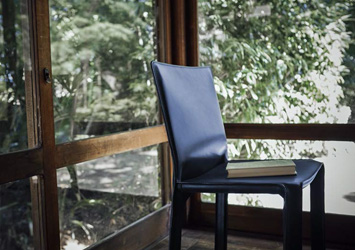 食卓を囲むダイニングのテーマは、つながり。人と人をつなぐ食事、人と食事をつなぐテーブル&チェア、窓から見える自然と室内をつなぐ家具……。そんな多様なものごとの間を取り持ち、全体をひとつにまとめる大切な役割を色彩が担っています。ダイニングのコーディネートには、マリオ・ベリーニの傑作、CABの新作カラーの中から、グレーとブルーをセレクトしました。しっくりとその場に馴染み一見すると落ち着いて見えるけれど華やかさのあるこのチェアの中間色が、庭の自然や建具の色合いと空間を、ほどよく馴染ませてくれます。また、日本家屋のダイニングに合わせるには、サイズが大きく骨太なイメージのある洋家具のテーブルやシェルフは、ガラス素材を選ぶことでボリューム感を調整。ゆるやかなつながりの中に見る、インダストリアルなテクスチャーと和素材のコントラストが、インテリアのアクセントとして効いています。